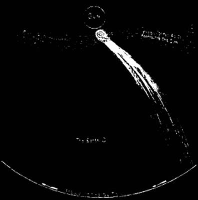 22 июня 1881 года астрономы внезапно заметили комету очень большой яркости. Ее не ожидали, а комета приближалась с большой скоростью. Иллюстрация, приведенная нами, показывает, как орбита кометы пересекла орбиту Земли. В точке наибольшего сближения, 19 июня, она отстояла от Земли только на двадцать восемь сотых расстояния Солнца от Земли.