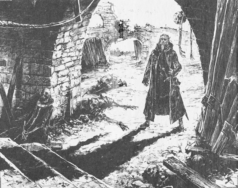 Хелиоглас направился к центральной башне, брезгливо морща тонкий, с горбинкой нос. Отполированные до зеркального блеска агатовые сапоги князя перешагивали через остатки надворных построек, сгнившие обломки карет, каких-то бочек, перемешанные с разбросанными повсюду костями и целыми скелетами представителей практически всех рас, в жилах которых текла кровь.