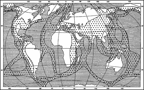 Самый протяженный пояс разрушительных землетрясений располагается по периферии Тихого океана (рис. 25). В его пределах чаще всего возникают катастрофические землетрясения, о двух из которых (Токийском и Чилийском) мы рассказали. Особенностью этой глобальной сейсмической зоны является также то, что к ней приурочено подавляющее большинство наиболее сильных цунами, поскольку очень часто эпицентры сильнейших землетрясений расположены подо дном океана. К этой высокосейсмической Тихоокеанской зоне приурочено и большинство действующих вулканов.