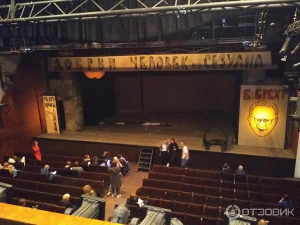 На мой взгляд, смотреть там было не на что. Занавес, похоже, в этом театре не использовался вовсе, и сцена была открыта зрителям вплоть до желтого задника; впрочем, какая-то черная занавеска справа имелась. Поверху был прикреплен большой транспарант из светло-серой холщовой ткани с гордой надписью «Добрый человек из Сезуана», выполненной «киношными» буквами. Слева висел небольшой плакат с указанием, что это «Театр улиц» – без разъяснений, что именно это означает, а справа – плохо выполненный портрет немолодого ухмыляющегося мужчины в очках и надписью «Б.Брехт». Автор пьесы, по которой и был поставлен самый известный спектакль Таганки. По сцене там и сям были разбросаны обтянутые парусиной невысокие параллелепипеды – их я уже видел в «Гамлете».