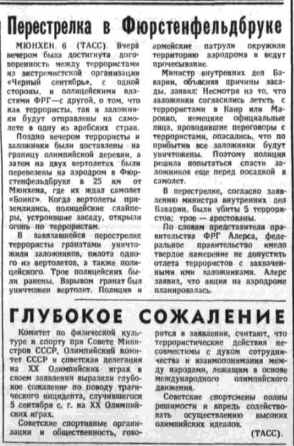 В центральной прессе впервые о теракте сообщили лишь 7 сентября – это событие было упомянуто сразу в трех небольших заметках на шестой странице газеты «Правда». В одну, посвященную в основном спорту, похоже, в последний момент добавили три коротких абзаца – да, были террористы, но все кончились, игры продолжаются, полицейских много, а канцлер Брандт выразил «глубокое сожаление» по поводу случившегося. Глубокое сожаление выразила и наша страна – в лице всесоюзного комитета по спорту, Олимпийского комитета СССР и советской команды.