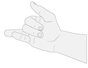 Пальцы правой руки сложены в Вишну Мудру: указательный и средний пальцы сгибаем и прижимаем к ладони; мизинец и безымянный прямые, вместе и направлены к большому пальцу (РИС. 3).