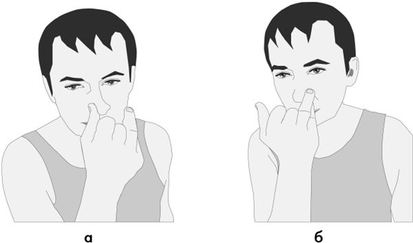 Делаем обычный вдох двумя ноздрями, большим пальцем правой руки закрываем правую ноздрю (РИС. 4, а) и делаем выдох левой ноздрей, выдох медленный, спокойный. И сразу же делаем медленный, равномерный вдох левой ноздрей. Закрываем левую ноздрю мизинцем и безымянным пальцем (РИС. 4, б). Правую ноздрю открываем и делаем медленный, равномерный выдох. Длина вдохов и выдохов должна быть одинакова. Это один цикл. Таких циклов можно проделать 8–10.