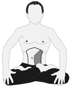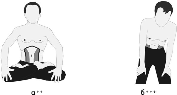 Исходное положение – стоя, сгибаем колени, кисти укладываем на бедра, ближе к коленям. Опираемся руками в бедра. Вдох делаем носом, затем делаем полный, глубокий выдох через рот и задерживаем дыхание. Во время выдоха втягиваем живот снизу вверх, как будто поднимаем мышцы живота к солнечному сплетению (РИС. 5). Продолжаем удерживать втянутый внутрь живот на задержке дыхания до тех пор, пока испытываем комфортное состояние. Потом спокойно отпускаем мышцы живота и делаем медленный и спокойный вдох.