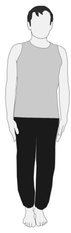 Исходное положение – стоя, ноги вместе, стопы вместе, пятки и большие пальцы стоп вместе. Пальцы стоп полностью на ковре, вытянуты. Ноги прямые, коленные чашечки подтянуты, мышцы ног напряжены. Ягодицы подтянуты, спина прямая, живот подтягиваем внутрь, грудную клетку слегка выталкиваем вперед. Плечи расправлены назад и опущены вниз. Шею вытягиваем, макушкой тянемся к потолку. Руки прямые, в легком тонусе, вытянуты вдоль бедер. Пальцы рук вместе, прямые (РИС. 10).