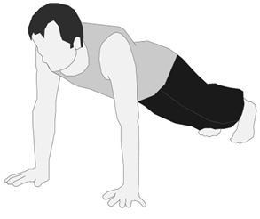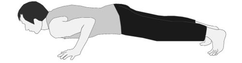 Из положения лежа на животе ладони укладываем по бокам от грудного отдела. Локти прижимаем по бокам. Ноги вместе, пальцы стоп на полу. Отталкиваемся руками от пола, приподнимаем корпус от пола. Руки в полусогнутом положении. Удерживаем вес тела на ладонях и пальцах стоп. Локти прижаты по бокам. Спина прямая, ягодицы подтянуты. Подтянуть живот (РИС. 14).