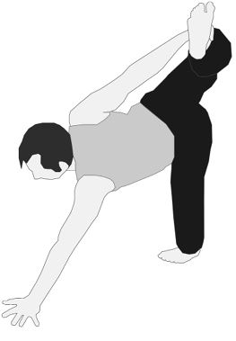 Секреты: голову поднять, взгляд вперед, перед собой; распределить вес тела между опорной стопой и ладонью, пятку опорной стопы развернуть слегка внутрь. Ногой тянем руку назад, вверх. Прогиб в груди.
