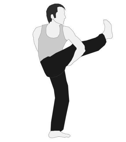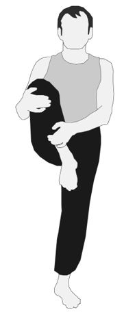Исходное положение – стоя, ноги прямые. Сгибаем правую ногу, берем двумя руками голень правой ноги и подтягиваем колено к груди. Спина прямая, левая опорная нога прямая (РИС. 35). Так же и на другую сторону.