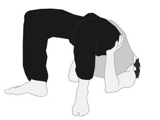 Исходное положение – лежа на спине. Сгибаем ноги в коленях, стопы на полу. Руками достаем голени. Ногами отталкиваемся от пола, поднимаем таз, спину от пола. Расслабляя мышцы спины, прогибаем грудную клетку, поднимаем ее вверх и подтягиваем ее к подбородку (РИС. 59).
