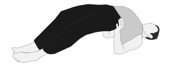 Лежа на спине, ноги сгибаем в коленях, стопы на пол, ближе к бедрам. Руки сгибаем в локтях, ладони за плечи, пальцы рук направлены к лопаткам. Отталкиваемся руками и ногами, приподнимаем корпус вверх, переносим вес тела на правую руку. Левое предплечье опускаем на пол. Переносим вес тела на левое предплечье, опускаем правое предплечье на пол. Голову опускаем в ладони, сложенные в форме чаши. Вес на предплечья. Разгибаем колени, стопы на полу. Таз толкаем вверх, ноги прямые (РИС. 60).