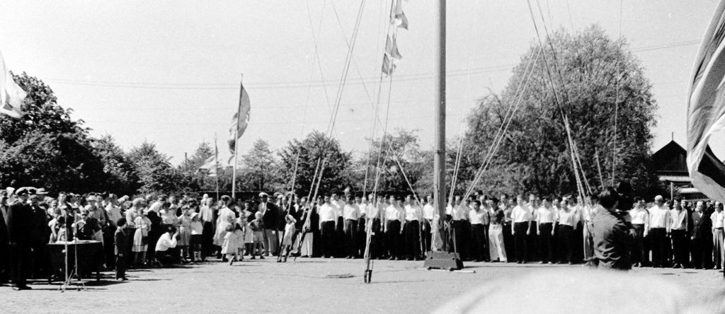 Парад открытия Чемпионата СССР 1957 года. Слева направо: второй Виктор Поппель, Борис Кулаженков (шкотовый Виктора Шапочкина), Михаил Песочинский (кажется шкотовый Николая Матвеева), Павел Паршин (шкотовый Виктора Горлова), Игорь Доминяк с флагом ДСО «Красная Звезда», за мной, правее Геннадий Семенович Назаров.