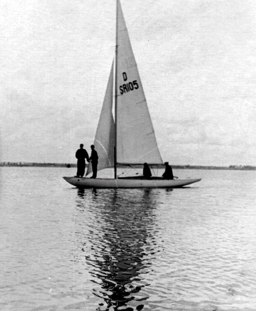 В день празднования открытия летней спортивной навигации яхт-клуба ВЦСПС 1956 года для участия в параде судов Юра взял меня матросом на свой «Ерш», вот тут-то и состоялось моё первое «оморячивание». Подул сильный шквал, мы чуть не перевернулись, справиться было почти невозможно, но я толком то и испугаться не успел, как мы выбросились на берег речки «Керосиновка». Я знал, что швертботы переворачиваются, и этого я как раз и боялся, но не знал, что у «Ерша» такой узкий кокпит, что, перевернувшись швертбот не заливается водой и, встав на шверт, его можно поставить. Однако в данном случае, чтобы не куролесить на виду у всех в парадной гавани, учитывая моё «невероятное мастерство швертботиста», Юра принял самое правильное решение.