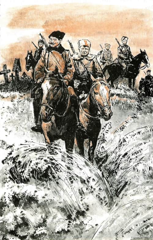 …В пустой, холодной избе конники легли, тесно прижавшись друг к другу. За окном взад и вперёд ходил часовой.