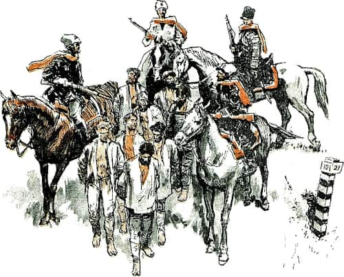 Из станицы выехали на конях четыре офицера, окружавшие полураздетых людей. Часовой у околицы отдал им честь.