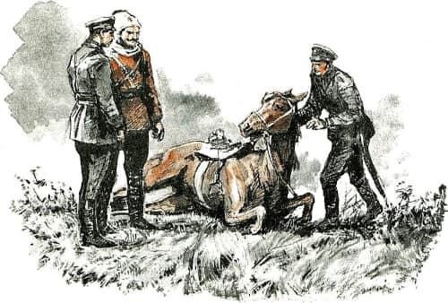 Будённый подошёл к тому месту, где упал Казбек. Казбек прерывисто дышал. Будённый стоял молча, опечаленный. Тяжело ему было расставаться с конём.