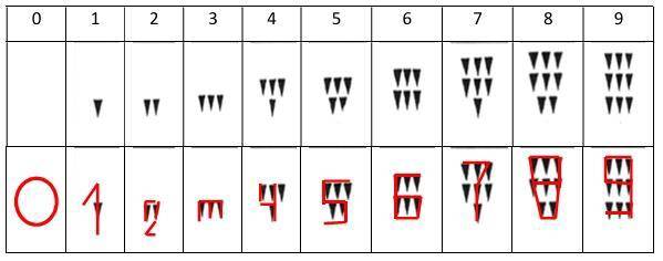– А я упростил для быстроты записи. Видите, в этой таблице чёрным – шумерские цифры. А красным поверх – то же самое, но в одно слитное движение. А сверху – конечная форма. Так писать проще и быстрее.