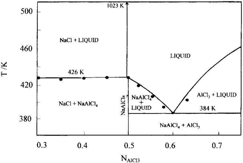 Что получается в результате? В интервале температур между 190 и 223 градусами по Цельсию смесь хлоридов натрия и алюминия будет жидкой в диапазоне соотношений от 1:1 до и 1:3. Просто замечательно! Получается, засыплю я втрое больше молей алюминиевой соли, чем натриевой, и могу спокойно электролиз запускать. Безо всякой мороки с металлическим натрием.
