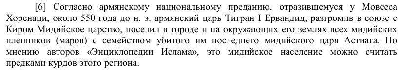 [6] Согласно армянскому национальному преданию, отразившемуся у Мовсеса Хоренаци, около 550 года до н.э. армянский царь Тигран I Ервандид, разгромив в союзе с КиромМидийское царство, поселил в городе и на окружающих его землях всех мидийских пленников (маров) с семейством убитого им последнего мидийского царя Астиага. По мнению авторов «Энциклопедии Ислама», это мидийское население можно считать предками курдов этого региона.