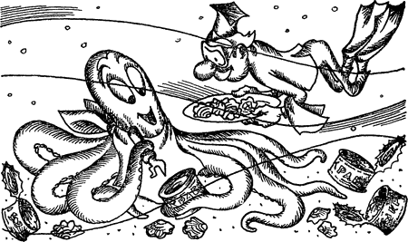 Щупальце, перегибаясь через край цилиндра, тянулось все дальше, неумолимо приближаясь к крабу, а осьминог полз за ним, поднимаясь вверх по стеклу. Наконец, щупальце коснулось краба и тут же отдернулось. Но лишь на мгновение. В следующую секунду осьминог ракетой перескочил через стеклянную стенку и сцепился с крабом.