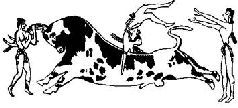 Знаменитые критские «бычьи игры». Гимнасты исполняют свои номера не на ковре, а на живом быке. Бык не дикий, домашний: в этом убеждает его пятнистая масть.