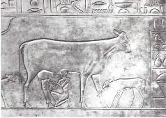 Египет. Начало третьего тысячелетия до нашей эры. Рельеф на саркофаге. Корова комолая, с хорошо развитым выменем. Это значит, что уже давно она одомашнена.