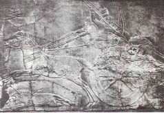 Настенный рельеф в Ниневии, столице Ассирии, VII век до нашей эры. Охота на львов царя Ашшурбанипала. Колесница массивная, четыре человека размещаются в ней. Судя по этому и по тройным вожжам, упряжка трехконная, хотя двух других лошадей не видно.