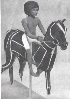 Египетская статуэтка XVI века до пашей эры. Удивительно здесь то, что лошадь верховая, под всадником! Ведь считается, что конница появилась впервые в IX веке до нашей эры у ассирийцев. До этого в боях участвовали лишь колесницы.