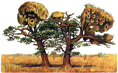 Впрочем, не только морской или приморский образ жизни побуждает птиц поселяться сообществами в прочной зависимости друг от друга. Наглядный пример – ткачики, близкие родичи воробьев, на которых они и похожи очертаниями тела и размерами.