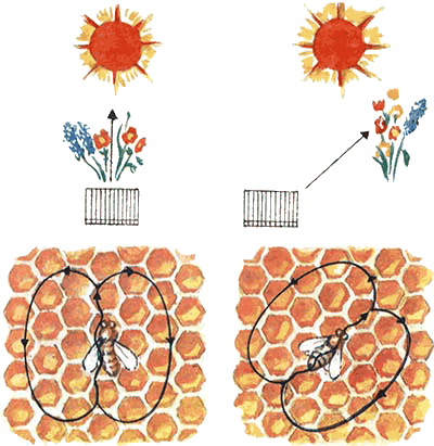 Если пчела, танцуя, бежит по соту в прямолинейной части танца головой вниз, значит, за пищей нужно лететь в сторону, противоположную солнцу. Когда бежит, виляя брюшком, головой вверх, там цель, где солнце. Если прямая танца отклоняется от направления силы тяжести под тем или иным углом, полет должен быть направлен под таким же углом к солнцу.
