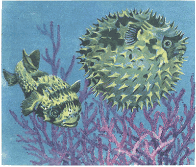 Где есть кораллы, там живут скалозубы. Эти степенные рыбки деловито исследуют рифы: не успеет коралловый полип спрятаться в домик-футляр, скалозуб подцепит его клювом, вытянет из домика и съест. Помахивает он плавничками и не спеша плывет вдоль рифа. Торопиться некуда: пищи кругом вдоволь, а врагов скалозуб презирает. Небольшая это рыбешка, но опасная. Если проглотит ее акула, плохо ей будет: скалозуб раздуется, и острые шипы, которыми усажена кожа, вонзятся в акулий желудок. Но скалозуб обычно заранее меры принимает. Увидит издали акулу – сейчас же начинает воду глотать и раздувается, как шар. Вода вливается в особый мешок под кожей брюха – слепой вырост пищевода. Бывает, что с водой скалозуб проглотит много воздуха (предполагают даже, что у него есть железа, которая воду разлагает на газы – водород и кислород). Тогда он переворачивается вниз спиной, всплывает и висит у поверхности воды вверх брюхом. Но опасность миновала, рыба с забавным хрюканьем выпускает из глотки воздух и воду. Снова становится нормальной, перевертывается вниз животом и спешит к своим кораллам.