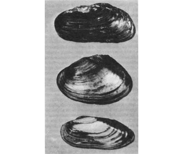 Пресноводная жемчужница маргаритана маргаритифера. Ниже – беззубка и перловица