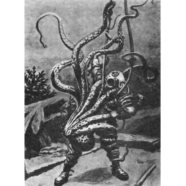 Вдруг «я почувствовал, – рассказывает водолаз, – что кто-то держит руку… Когда муть рассеялась, я увидел, к своему ужасу, щупальце большого осьминога, обвившееся вокруг моей руки, подобно удаву. Боль была нестерпимой: словно тело мое разрывали на куски, и чем отчаяннее я пытался освободиться, тем сильнее становилась боль.