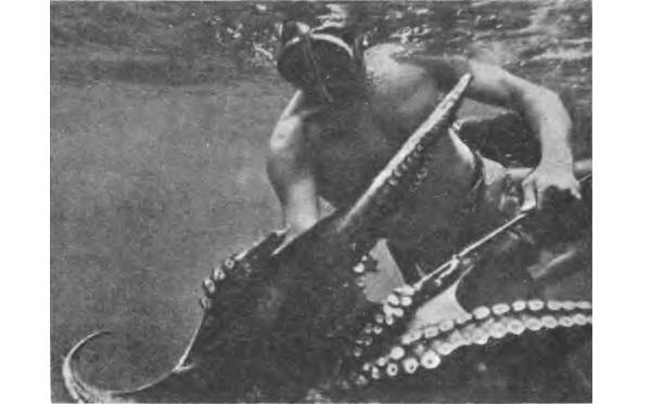 Можно было бы привести здесь много рассказов о битвах водолазов с осьминогами. Возможность такой схватки ни у кого не вызывает ни малейшего сомнения. Осьминог и водолаз – две всем хорошо известные фигуры из «мира приключений» подводного царства. Единоборство с осьминогом, по общему мнению, одна из неизбежных неприятностей в профессии водолаза.