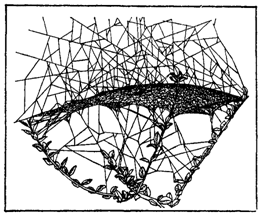 Прежде чем состоится наше знакомство с пауками, плетущими сети с открытым центром, пойдем и поближе рассмотрим паутину ещё одного необычного образца. С сектора до круга начали мы наш обзор наиболее совершенных тенет. Здесь сделаем один шаг назад, ибо паук, о котором сейчас пойдет речь, плетет круг без сектора!