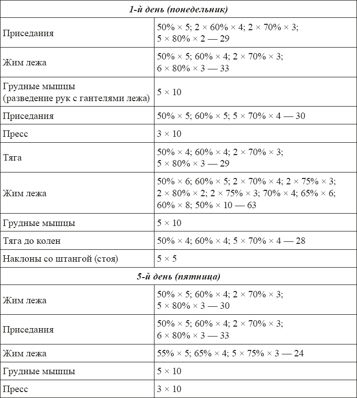 Чтобы не быть голословным, приведу пример одной тренировочной недели по плану Шейко (подходы × вес × повторения, если количество подходов не указано – оно по умолчанию равно одному). Эти нагрузки предлагается назначать атлетам уровня КМС-МС.