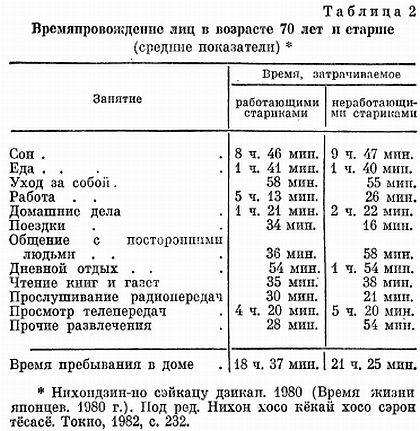 Образ домашней жизни пожилых людей, как тех, кто проживает совместно с детьми, так и тех, кто живет отдельно, отличается в ряде отношений от образа жизни людей других возрастов… Сопоставляя сведения, приведенные в табл. 2, с цифровыми данными, характеризующими усредненный распорядок дня лиц иных возрастных групп, авторы книги «Время жизни японцев», подготовленной радиокорпорацией Эн-эйч-кэй на основе массовых обследований населения страны, выделяют следующие особенности образа жизни пожилых людей.