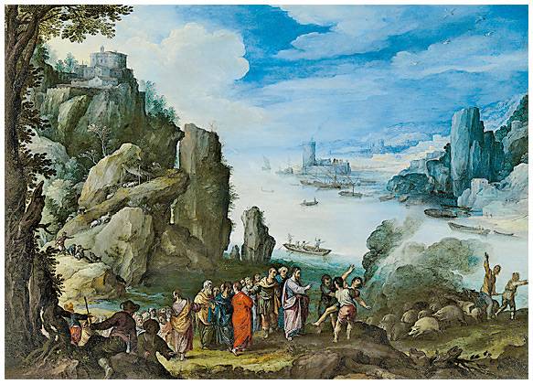 «И приплыли в страну Гадаринскую, лежащую против Галилеи. Когда же вышел Он на берег, встретил Его один человек из города, одержимый бесами с давнего времени, и в одежду не одевавшийся, и живший не в доме, а в гробах. Он, увидев Иисуса, вскричал, пал пред Ним и громким голосом сказал: что Тебе до меня, Иисус, Сын Бога Всевышнего? умоляю Тебя, не мучь меня. Ибо Иисус повелел нечистому духу выйти из сего человека, потому что он долгое время мучил его, так что его связывали цепями и узами, сберегая его; но он разрывал узы и был гоним бесом в пустыни. Иисус спросил его: как тебе имя? Он сказал: легион, – потому что много бесов вошло в него. И они просили Иисуса, чтобы не повелел им идти в бездну. Тут же на горе паслось большое стадо свиней; и бесы просили Его, чтобы позволил им войти в них. Он позволил им. Бесы, выйдя из человека, вошли в свиней, и бросилось стадо с крутизны в озеро и потонуло. Пастухи, видя происшедшее, побежали и рассказали в городе и в селениях. И вышли видеть происшедшее; и, придя к Иисусу, нашли человека, из которого вышли бесы, сидящего у ног Иисуса, одетого и в здравом уме; и ужаснулись. Видевшие же рассказали им, как исцелился бесновавшийся. И просил Его весь народ Гадаринской окрестности удалиться от них, потому что они объяты были великим страхом. Он вошел в лодку и возвратился. Человек же, из которого вышли бесы, просил Его, чтобы быть с Ним. Но Иисус отпустил его, сказав: возвратись в дом твой и расскажи, что сотворил тебе Бог. Он пошел и проповедовал по всему городу, что сотворил ему Иисус».