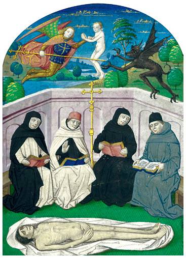 Люди XIII–XV веков пытаются по-новому осмыслить смерть, так как этого не делали их предшественники. На миниатюрах той эпохи появляется ангел с книгой добрых и злых дел человека, появляется архангел Михаил, который взвешивает его дела, появляется Христос, исполняющий обязанности судьи. Дева и Иоанн, те, кто стоял у Креста Господня, выступают в роли адвокатов умирающего, а Дьявол и его присные – в роли прокуроров.