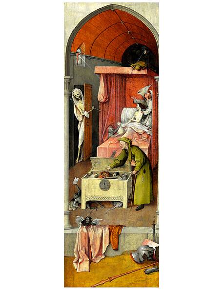 И это было первое, самое простое искушение Лукавого. Когда он видит, что не преуспел, то стремится ввергнуть уставшего от борьбы человека в уныние. Он рисует пред мысленным взором умирающего картины содеянного им и говорит: «Ты блудодей, ты клятвопреступник, ты убийца, ты жил в скупости». К телесной боли Дьявол добавляет боль душевную, стремясь сломить человека. Он напоминает все нераскаянные и постыдные грехи, рисуя перед человеком картину того, что спасение для него невозможно, а исповедать те грехи в смертный час – ложь и лукавство. Но ангел советует обратить оружие Дьявола против него самого: напомнил черт грехи – превосходно, зови священника. Ибо как ни велики наши грехи, они камень, который утонет в океане Божьего милосердия без следа. И не стоит забывать про разбойника, распятого одесную Спасителя. Он, именно он, первым вошел в рай. И про притчу о работниках одиннадцатого часа тоже не следует забывать.