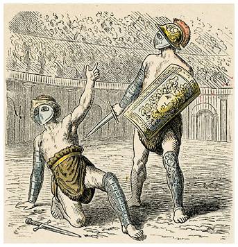 Гладиаторские бои. Побежденный гладиатор молит толпу о пощаде