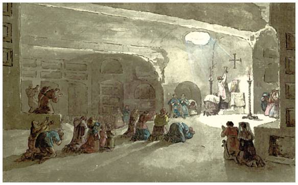 Кроме того, что катакомбы были для первых христиан кладбищем, они были для них и местом молитвенных собраний. Туда они спускались служить литургию – таинство Тела и Крови Христа. Дело в том, что ночью, будучи де-юре членами одного из множества похоронных братств, они могли спокойно выходить из города и возвращаться в него уже с рассветом. От этих ночных (по необходимости) служб и сложилась традиция, что самые важные и торжественные службы и сейчас свершаются именно в это время суток. И ночные крестные ходы есть рудимент той же необходимости, как и принесение свечей в храм. Тогда их несли просто из-за того, что в катакомбах было темно.