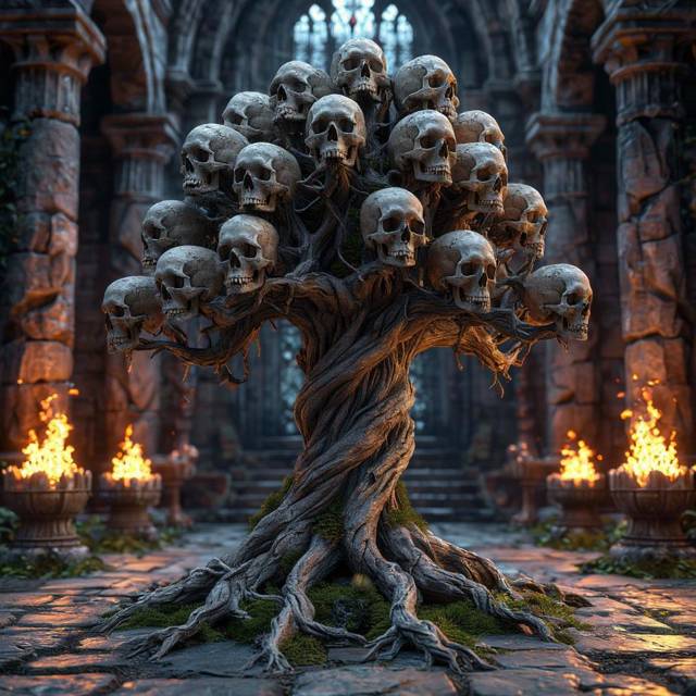 Я вошёл в склеп. Воздух здесь был густым и холодным. Сата стояла спиной ко мне, уставившись на своё творение. Костяное древо, освещённое голубоватым свечением из глазниц черепов, одновременно выглядело жутко и впечатляюще.