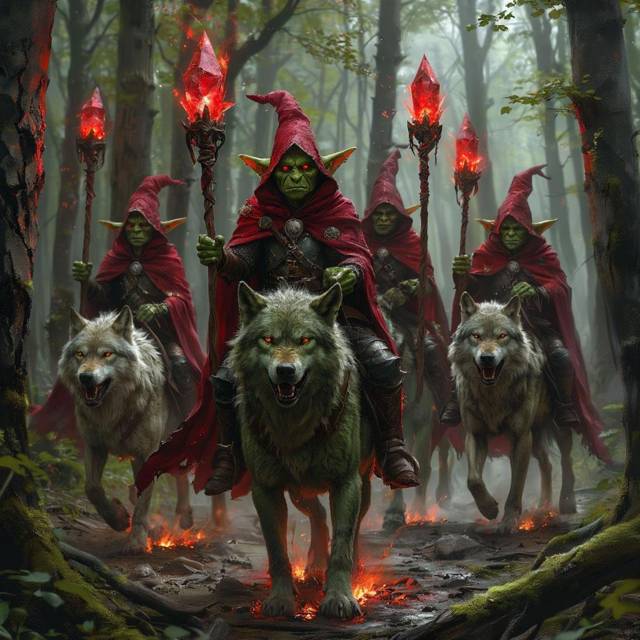 Впереди, метрах в пятидесяти, на тропе появилась группа гоблинов. Они сидели на волках, облаченные в длинные красные мантии, держа в руках посохи с горящими красными кристаллами на вершинах.
