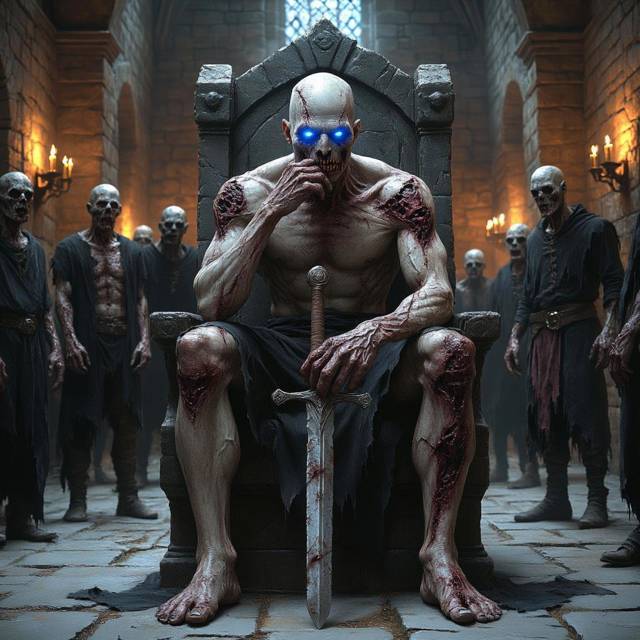 В этот момент Изверг спокойно сидел на троне, уперев ладонь в подбородок, с видом пресыщенного правителя. Его тело, покрытое гноящимися язвами, источало силу, явно несвойственную обычному зомби. Глаза пылали холодным, разумным огнём ненависти. Вокруг него, словно придворные, толпились десяток обычных зомби. А по поотдаль, выстроившись в подобие строя, стояло около десятка скелетов – не хлипкие, как прежде, а в потрёпанных, но целых кожаных доспехах, с мечами в костяных руках.