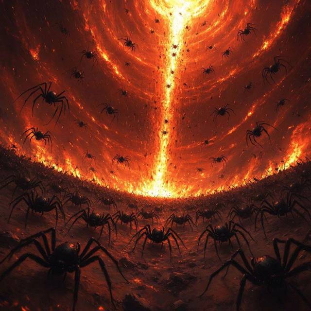 А вокруг этой ямы горело всё. Пауки, деревья, кусты, даже воздух, казалось, пылал сизым от жары маревом. Те зелёные твари, что не попали в эпицентр, взрывались, как перегретые котлы, забрызгивая всё вокруг горящей кислотой. Другие, охваченные пламенем, метались и падали, превращаясь в чёрные, обугленные останки.