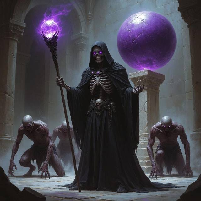 Плоть на его руках и лице потемнела, затем потекла на пол, словно расплавленный воск, обнажая почерневшие от времени и магии кости. Уже через несколько мгновений перед пульсирующим ядром стоял не старик, а его истинная форма – высокий, иссохший скелет, от которого веяло ледяным дыханием веков. В его пустых глазницах разгорелись две точки тёмно-пурпурного, почти чёрного огня – отсветы вечной тьмы, что горела в его душе.
