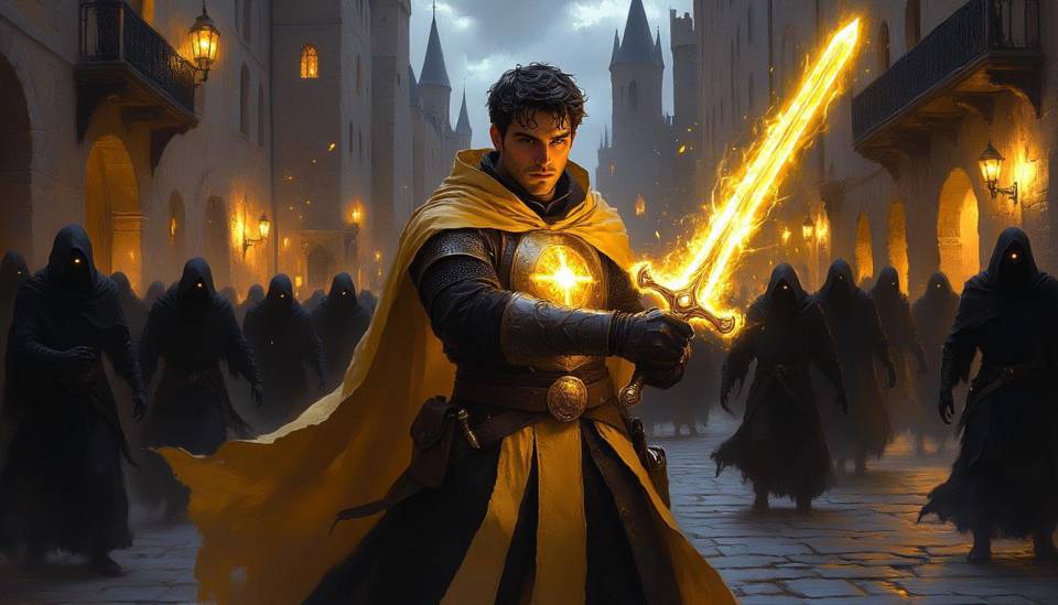 Он сделал шаг навстречу надвигающимся теням, его пылающий клинок описал в воздухе широкую дугу, и снопы ослепительных золотых искр полетели в сторону призрачных созданий. Тени завизжали, отшатываясь от священного пламени, которое прожигало их эфемерные формы.