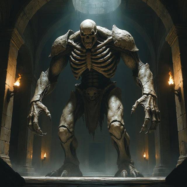 Он был поистине исполинских размеров, затмевая всех предыдущих големов не просто ростом, а самой своей сутью. И это не было хаотичным нагромождением костей, как у его предшественников. Каждый элемент его скелета выглядел тщательно подогнанным и неестественно массивным. Большинство его частей выглядели как сросшиеся в сплошной панцирь и напоминали базальтовые плиты. Плечевые кости и предплечья были цельными, будто выточенными из слоновой кости гигантом.