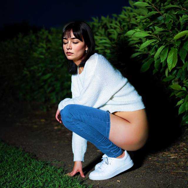 Лейла стояла к нему лицом, уже стянув джинсы и малиновые трусики до колен. Лунный свет мягко ложился на изгиб её бедра, подсвечивая гладкую, идеально ухоженную кожу. Затем она медленно присела на корточки, опустив голову вниз, её глаза были закрыты, а нижняя губа прикушена от предвкушения желанного облегчения.