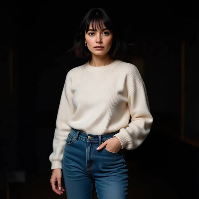 Она была одета в простые облегающие синие джинсы и светлый снежный свитер. В одной руке она держала свёрнутый поводок, а другой придерживала дверь.